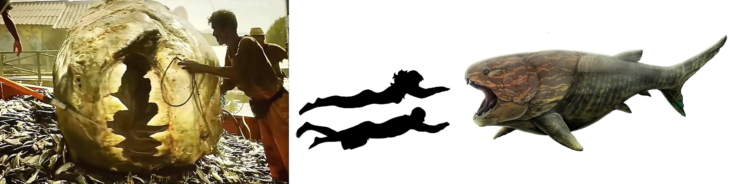 Abgesehen davon ist der Dunkleosteus-Schädel viel zu gewaltig und deutlich größer als der eines Großen Weißen Hais (Carcharodon carcharias). Tatsächlich war Dunkleosteus aber bei weitem nicht so groß. Jüngere Schätzungen deuten auf eine maximale Länge von 3 bis 4 Metern. Früher kursierten viel größere Längenangaben, die aber auf Proportionsmessfehler zurückzuführen sind. Dukleosteus war sicher trotzdem eines der größten Tiere seiner Zeit, aber längst nicht so gewaltig wie der im Film gezeigte Schädel vermuten lässt.