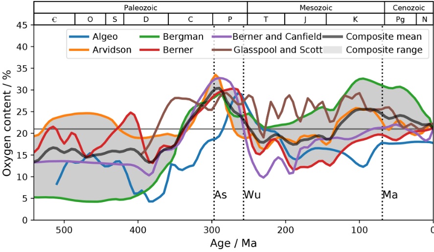 Tatsächlich begann der Gigantismus der Dinosaurier im frühen Jura, als der Sauerstoffgehalt sogar noch unter dem Niveau von heute lag, nämlich bei ungefähr 16 bis 18%. Heute sind es 21%! Diesen Wert erreichte die Atmosphäre etwa im Mitteljura, stieg dann am Ende des Jura auf etwa 24% an und erreichte einen Spitzenwert von etwa 30% am Übergang von Unter- zu Oberkreide. Danach schwankte der Wert zwischen 26 und 29%. Den Dinosauriern haben diese Schwankungen aber nicht viel ausgemacht. Und auch unsere Luft könnten sie heute problemlos atmen.